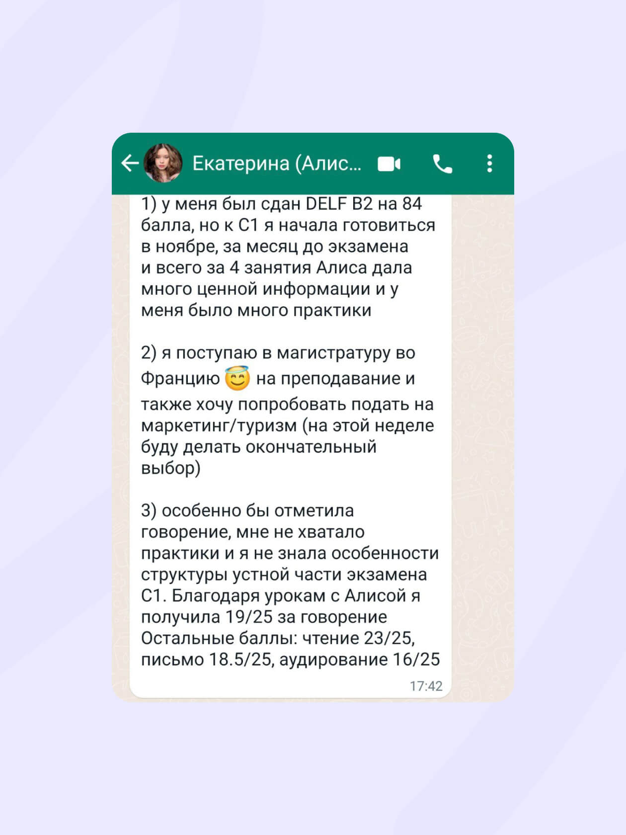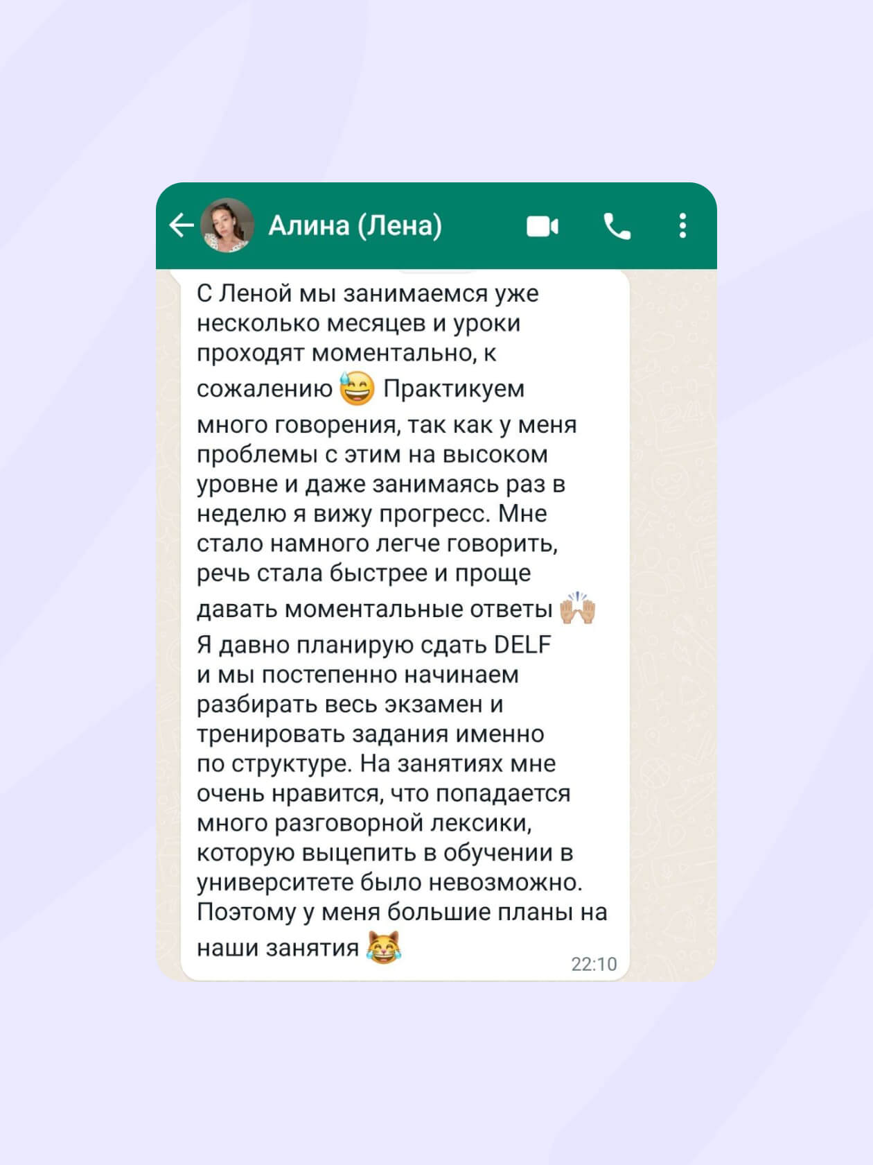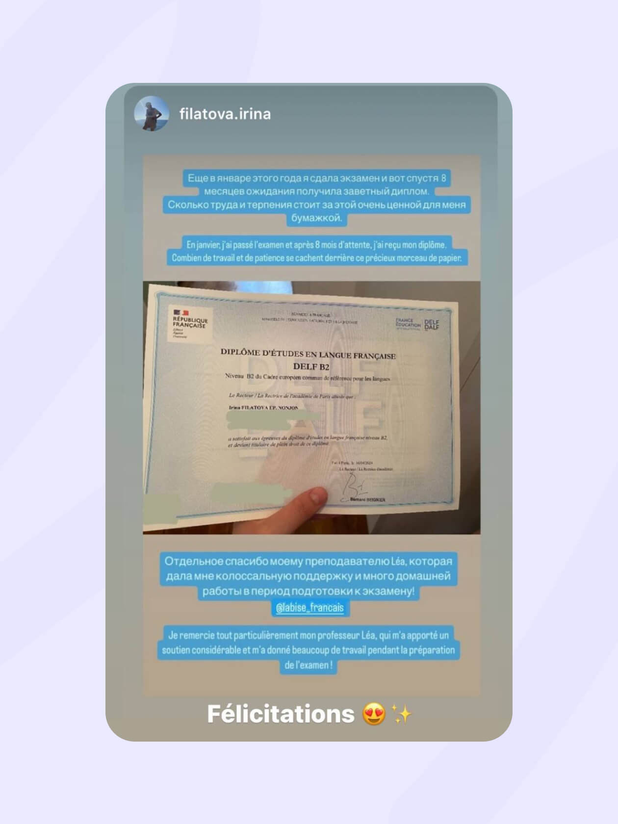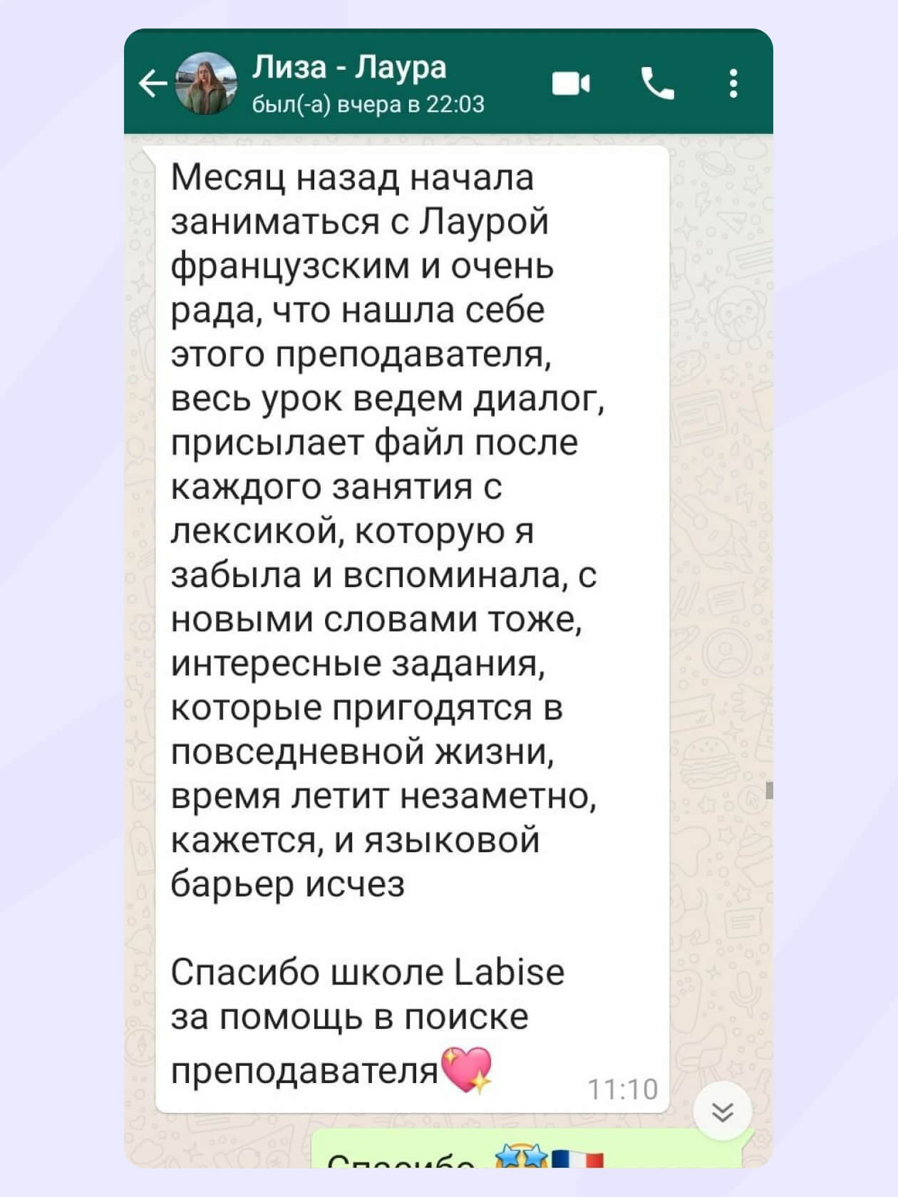 Планируете обучение во Франции и не знаете, с чего начать? Консультация по поступлению во Францию от нашей онлайн-школы французского языка Labise поможет вам разобраться во всех нюансах, избежать распространенных ошибок и подготовиться к поступлению уверенно и грамотно. Услуги нашей школы включают профессиональную помощь куратора, который даст развернутые рекомендации по каждому этапу поступления и ответит на все важные вопросы.