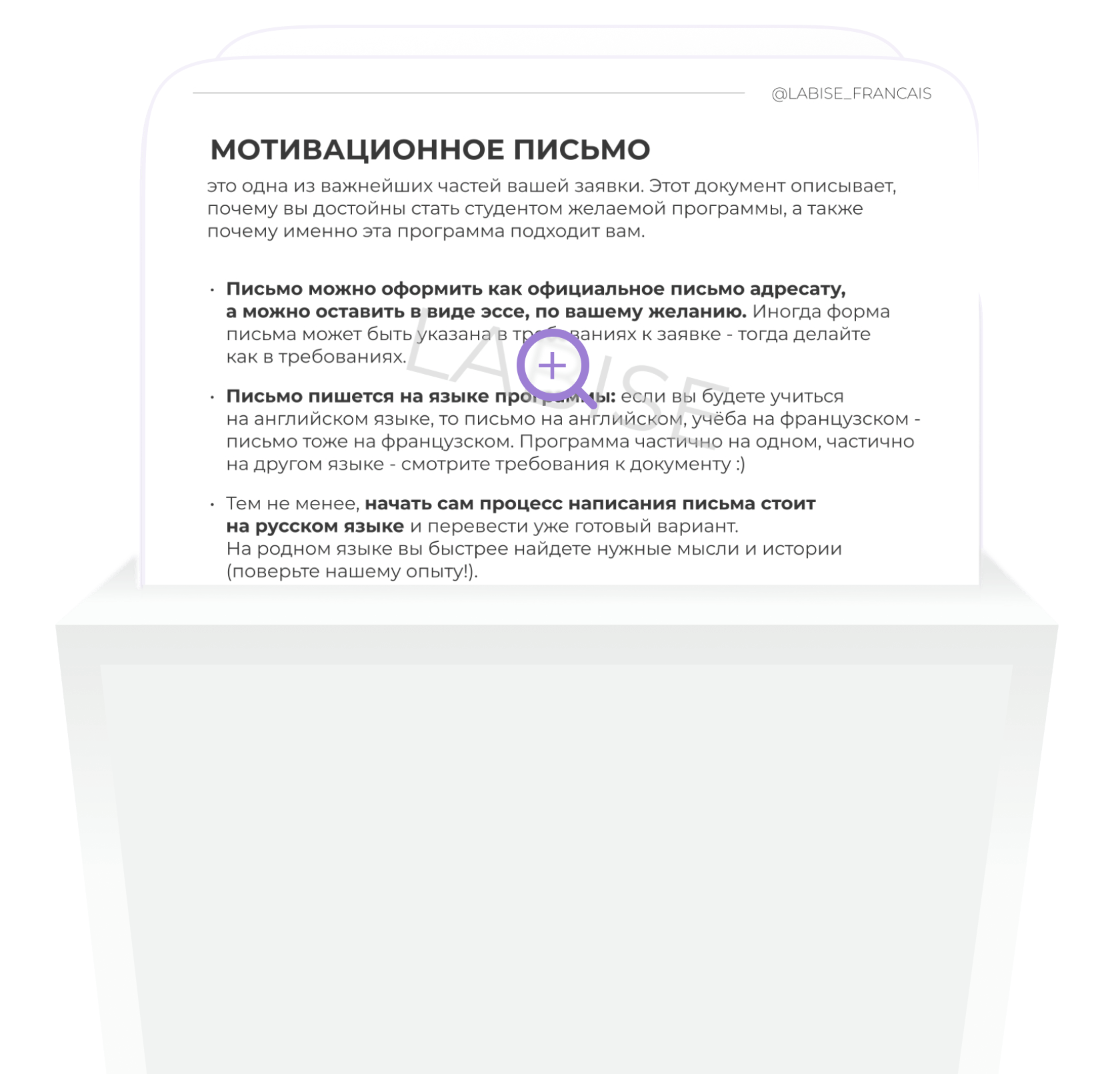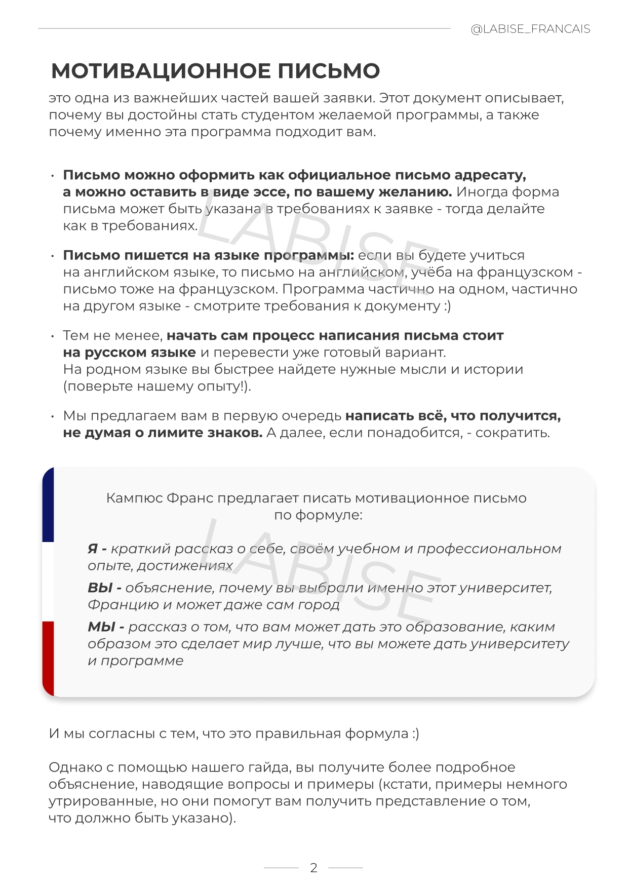 Почему стоит выбрать Labise?Labise не просто обучает французскому языку – мы делаем всё, чтобы помочь вам достичь ваших академических и карьерных целей. Наши кураторы обеспечат полное сопровождение на каждом этапе поступления и помогут избежать возможных ошибок. Мы также предлагаем возможность рассрочки на оплату наших услуг, чтобы вы могли получить необходимую поддержку и консультации, не откладывая мечту в долгий ящик.